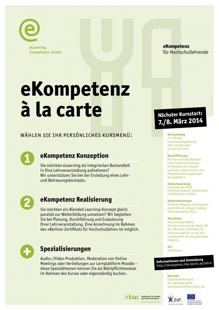 Die einsemestrige Weiterbildung „eKompetenz für Hochschullehrende“ an der HTW Berlin bietet interessierten Lehrenden die Möglichkeit, sich intensiv mit der eLearning-Thematik auseinanderzusetzen und im Austausch mit KollegInnen und ExpertInnen zu lernen.