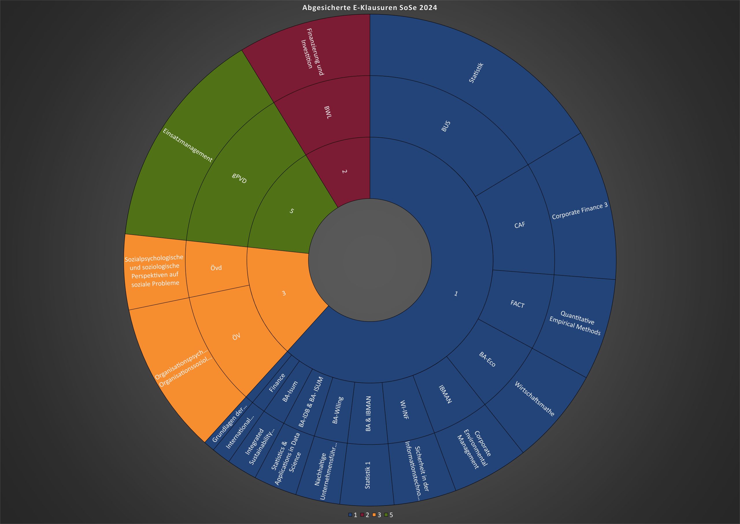 Im Diagramm rechts können Sie ausgewählte vom ELZ betreute E-Klausuren des Sommersemester 24 ansehen. Der innere Ring bildet die Fachbereiche ab, der mittlere Ring die Studiengänge und der äußere Ring die Module, in denen die Klausuren geschrieben wurden. Die Größe der Modulfelder und damit auch die der inneren Ringe richtet sich nach den Teilnehmendenzahlen der jeweiligen Prüfungen (A- und B-Termin zusammengefasst).