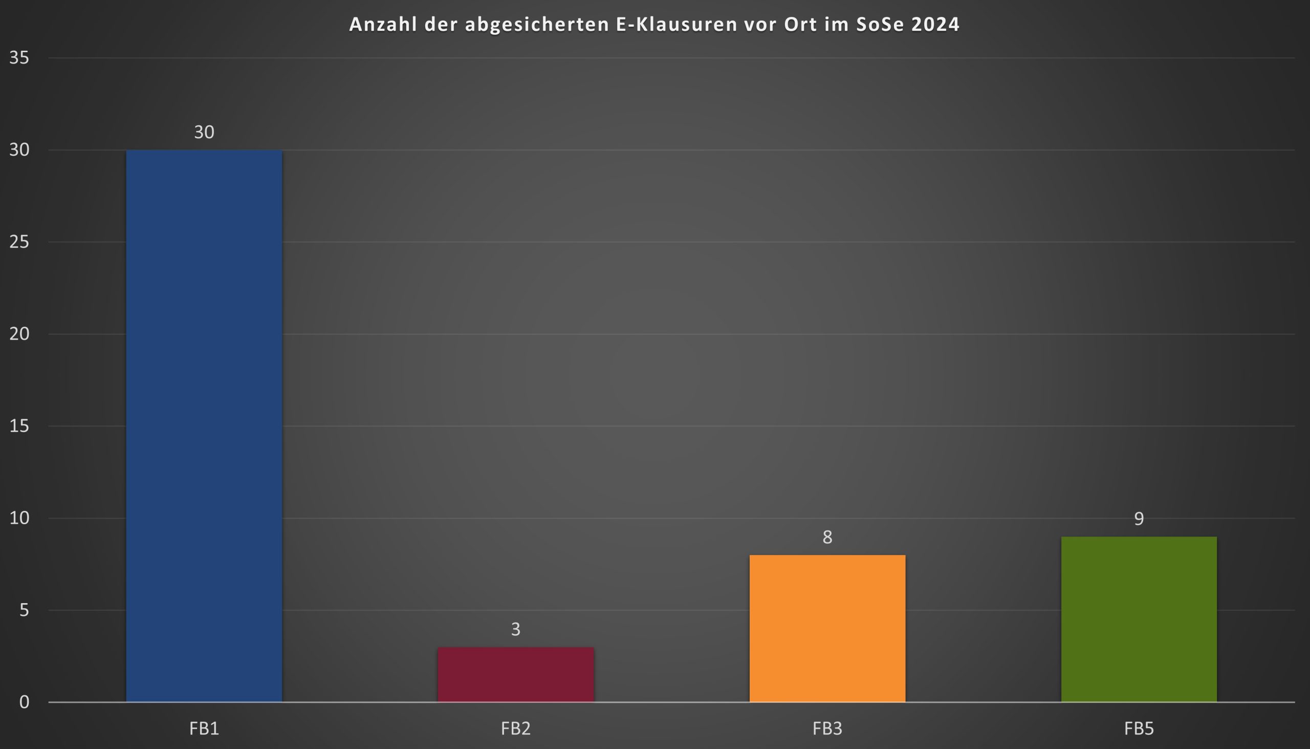 Wir freuen uns Ihnen mitteilen zu können, dass wir uns auch zum Sommersemester an einem kleinen Zuwachs an E-Klausuren erfreuen dürfen. Die neuen Klausuren kamen aus den Fachbereichen 1, 2 und 3. Wir begrüßen alle neuen und alten Interessierten herzlich. Insgesamt wurden 50 abgesicherte E-Klausuren vor Ort durchgeführt, wobei einige Klausuren zusammengesetzt waren. Dabei wurden 1755 Einzelleistungen abgegeben.