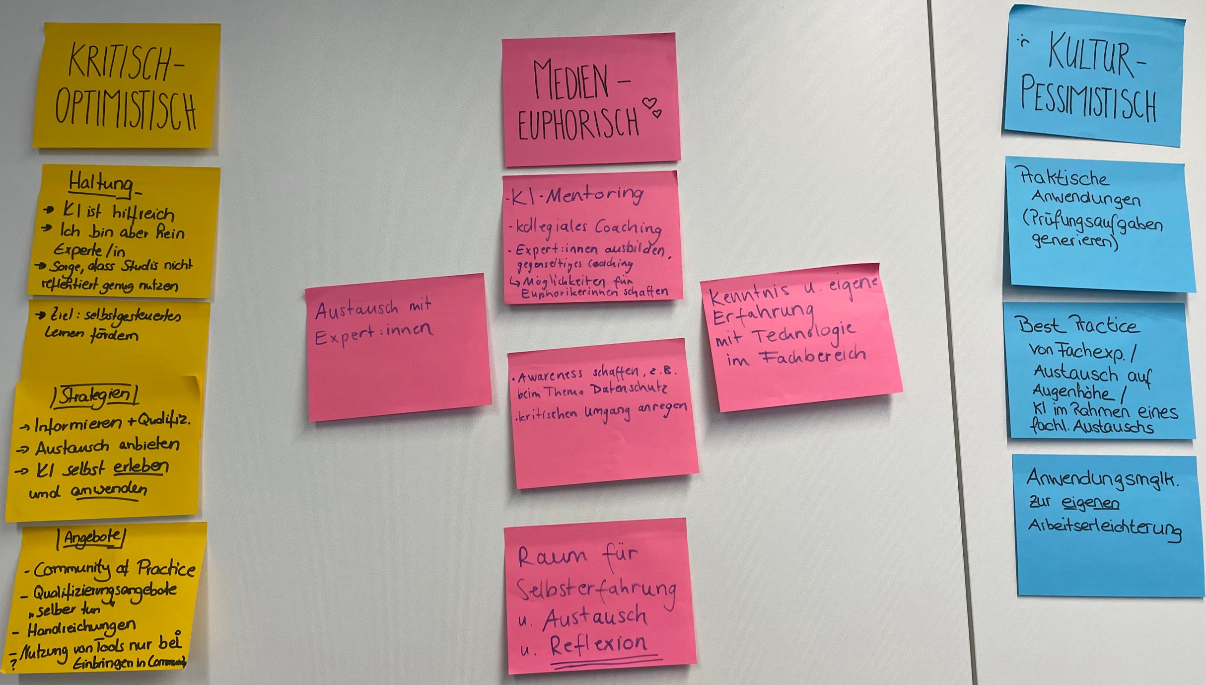 Es wurden diverse Themenfelder an Hochschulen definiert, die von KI beeinflusst werden und darüber diskutiert, ob man auch der KI eine eigene Rolle/eigene „Persona“ als selbstständiger Akteur in der Community of Practice zugestehen sollte.