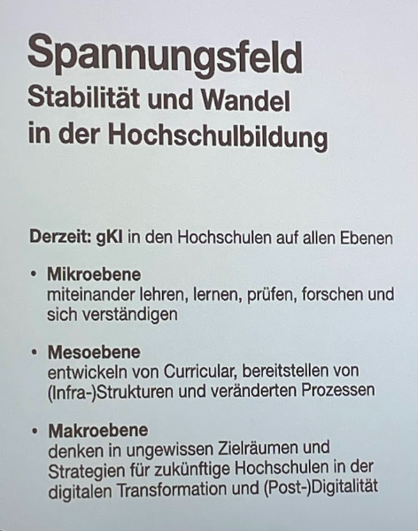 Die Konferenz war eine wertvolle Lerngelegenheit und hat mich wieder einmal motiviert, weiterhin am Thema dranzubleiben. Auch wenn wir an der Hochschule auf Expertenwissen zu Kl angewiesen sind, kann sich wohl niemand dem Thema entziehen. Es wurde deutlich, dass die Implementierung von KI-Technologien an Hochschulen nicht nur eine Frage der technischen Machbarkeit, sondern auch der nachhaltigen und strukturellen Integration in die akademische Landschaft ist. Die Konferenz zeigte auch auf, dass es nicht genügt, sich dabei auf zeitlich befristete Drittmittelprojekte zu verlassen, die keine langfristigen strukturellen Veränderungen bewirken.