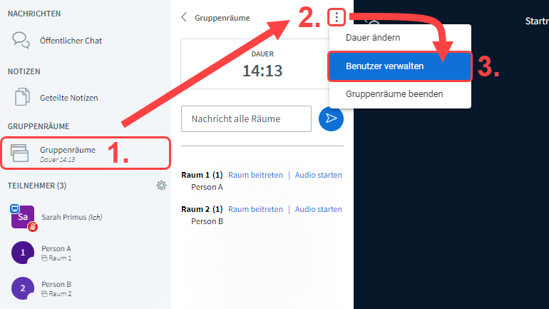Sind die Gruppenräume erstellt, ist über die Option „Benutzer verwalten“ ein leichteres Verschieben von Teilnehmenden zwischen den Gruppenräumen möglich.