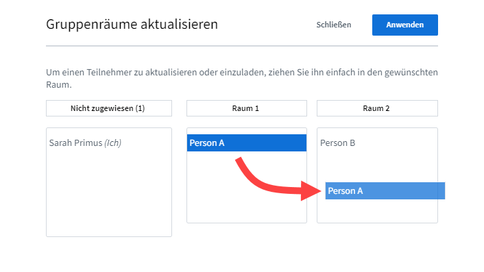 Nach dem Aufruf der Option muss im Dialogfeld „Gruppenräume aktualisieren“ dafür eine Person mit der Maus einfach von einem Raum in einen anderen gezogen werden.