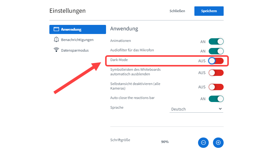 BigBlueButton unterstützt nun einen dunklen Modus. Um diesen zu aktivieren, navigieren Sie zu den Einstellungen (die drei Punkte oben rechts) und aktivieren Sie „Dark mode“.