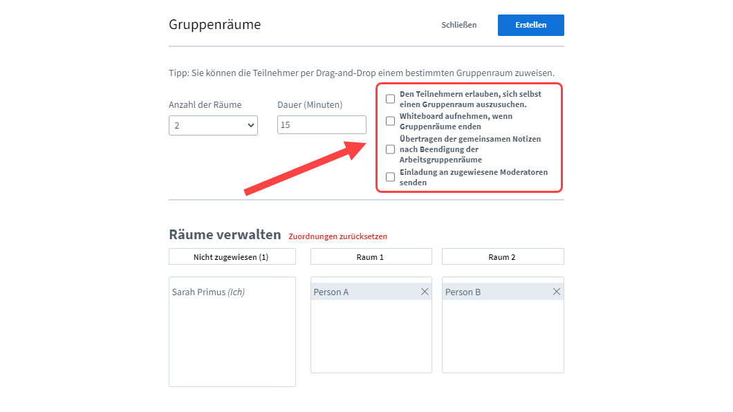 - Den Teilnehmern erlauben, sich selbst einen Gruppenraum auszusuchen
