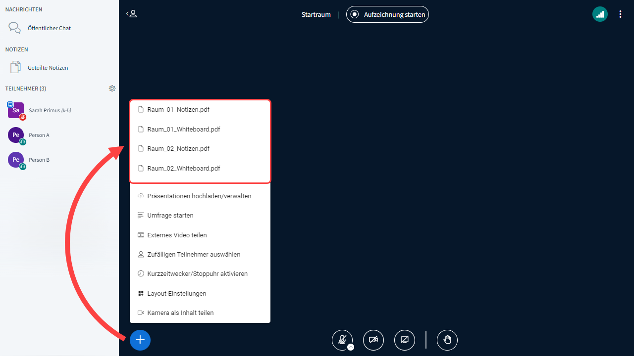 Mit der Option 2 und 3 ist es möglich, die in den Gruppenräumen gemachten Whiteboard-Anmerkungen sowie die dort geteilten Notizen als weitere Präsentationen mit in den Hauptraum zu nehmen.