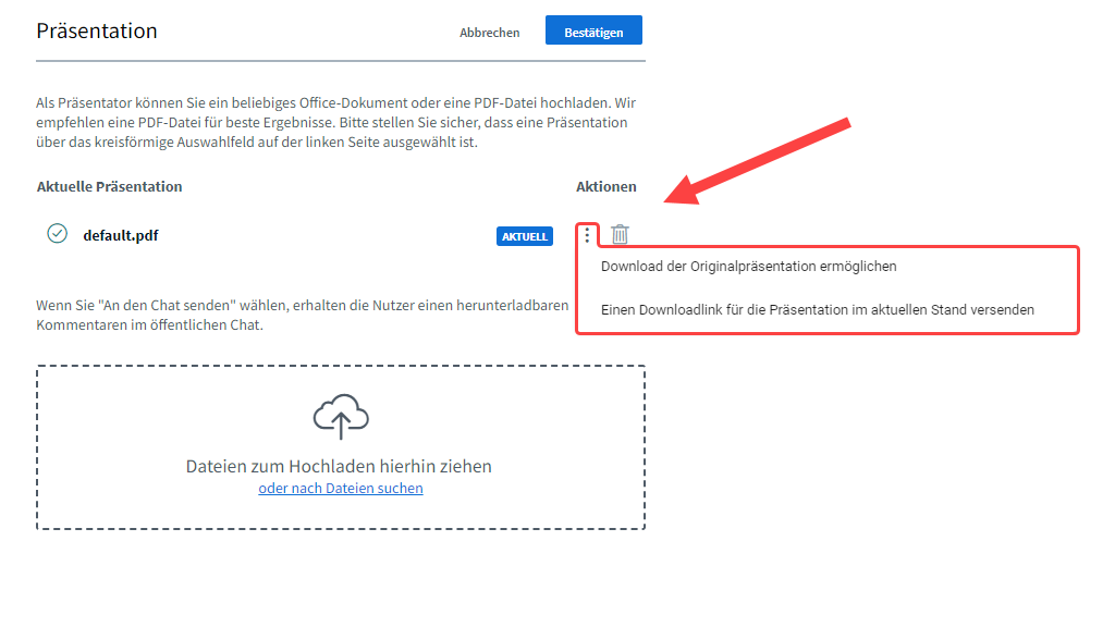 Im Fenster „Präsentationen hochladen/verwalten“, welches über den blauen Aktionen-Button (+) aufgerufen werden kann, stehen nun zwei Exportoptionen zur Verfügung (die drei Punkte rechts neben einer Präsentation):