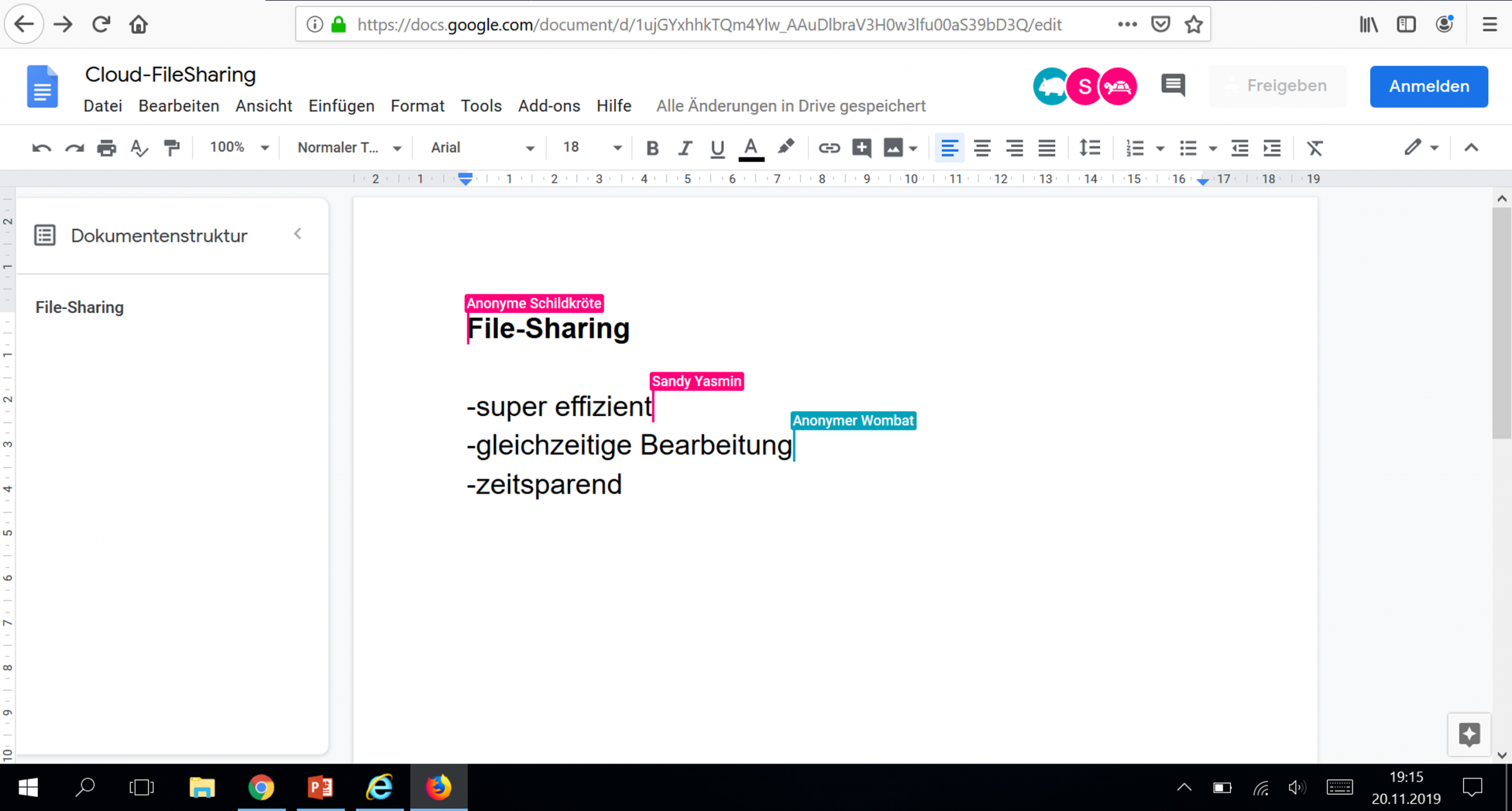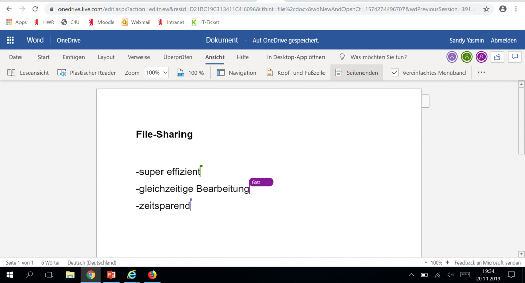 Nicht nur bei Projektarbeiten ist eine cloudbasierte Textverarbeitung hilfreich, auch in den regulären Vorlesungen ist es von Vorteil gemeinsam Notizen zu sammeln. So können mögliche Fehlzeiten durch gemeinschaftliche Notizen kompensiert werden und zu einer höheren Erfolgsquote in Klausuren führen.