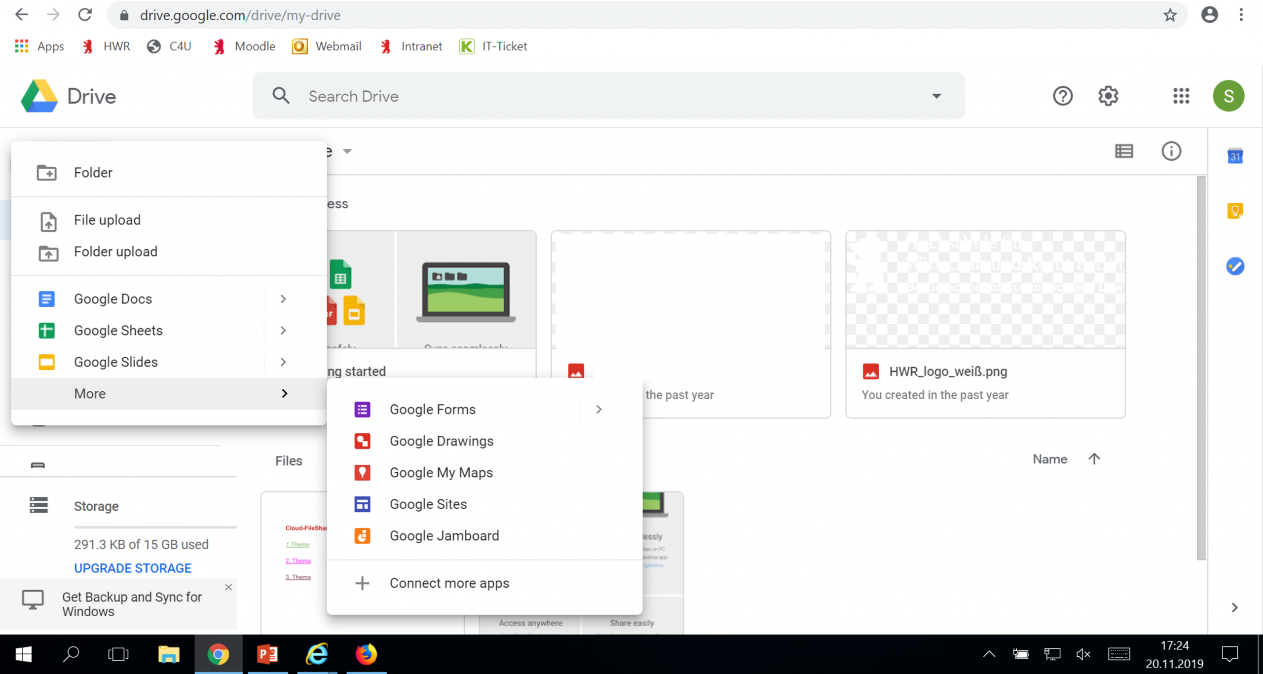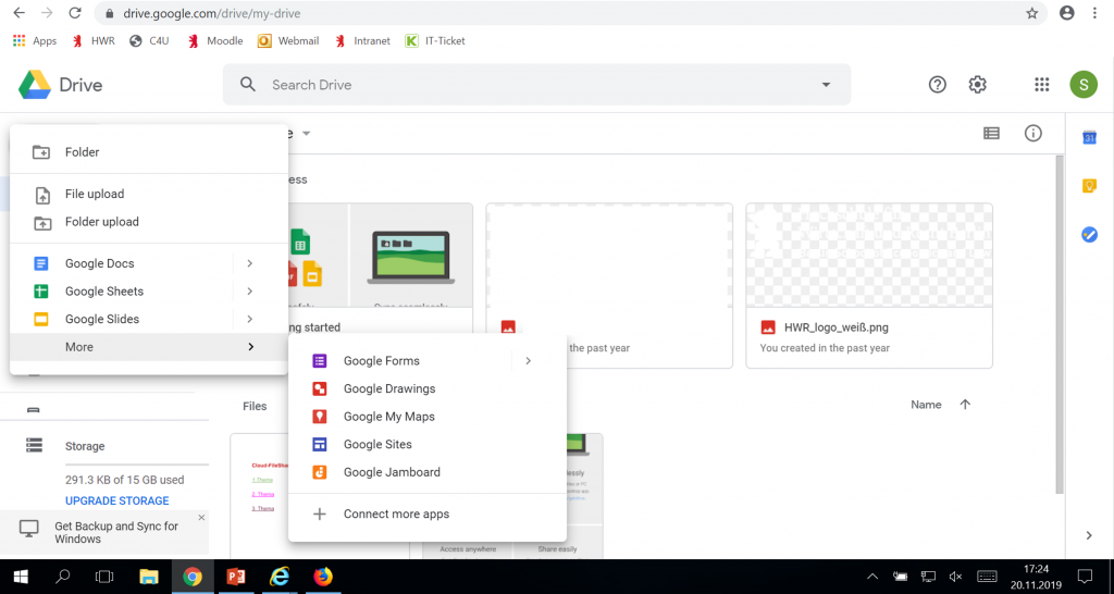 Der beliebteste Cloud-Dienstleister unter den Studierenden ist Google Drive. Dieser bietet eigene Applikationen zur Textverarbeitung, Tabellenkalkulation und Präsentation an. Je nach Bedarf können weitere heruntergeladen werden. 15 GB Speichervermögen stellt Google kostenlos zur Verfügung.