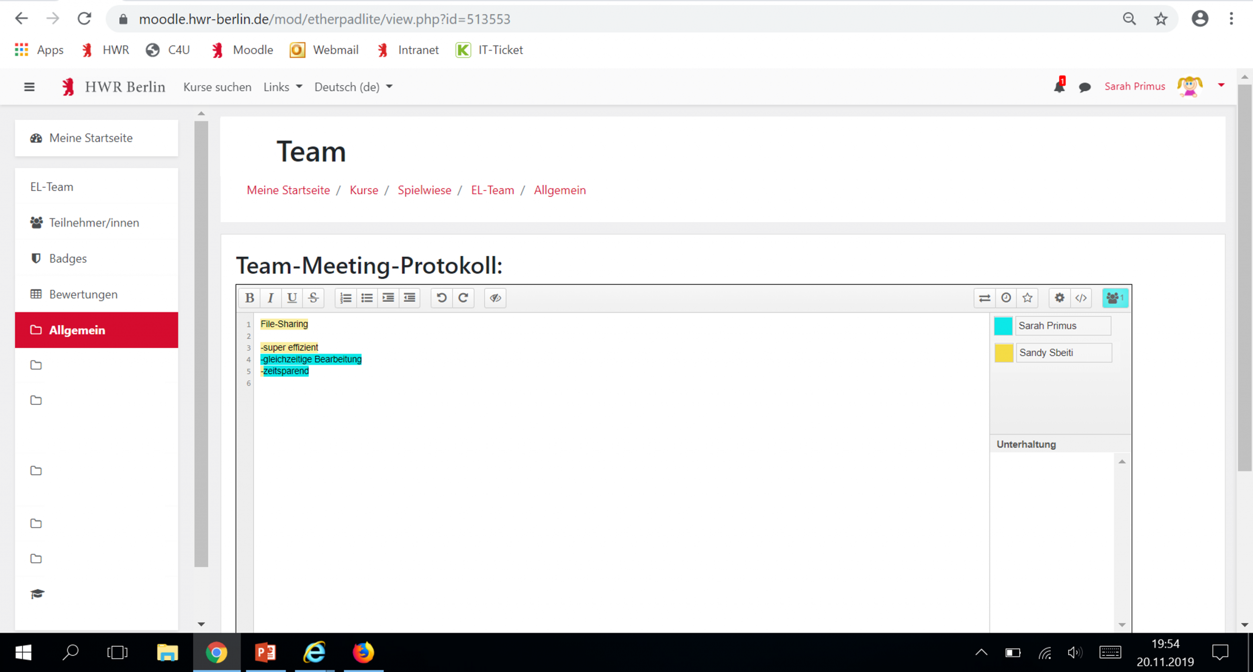 Moodle bietet euch eine interne Plattform mit diversen Tools zur Bearbeitung von Dateien, Zeitmanagement, Abstimmungen und vielem mehr. Das Tool Etherpad ermöglicht es euch mit farblich markiertem Hintergrund geschriebenes voneinander zu unterscheiden. Daher erkennt ihr sofort wer welchen Beitrag verfasst hat. Nach Fertigstellung der Gruppenarbeit könnt ihr ganz einfach eure*n Dozent*in in den Kurs einschreiben. Fragt das E-Learning Zenrum nach einem seperaten Moodle-Kurs und werdet kreativ! Dazu ein ergänzender Beitrag!
