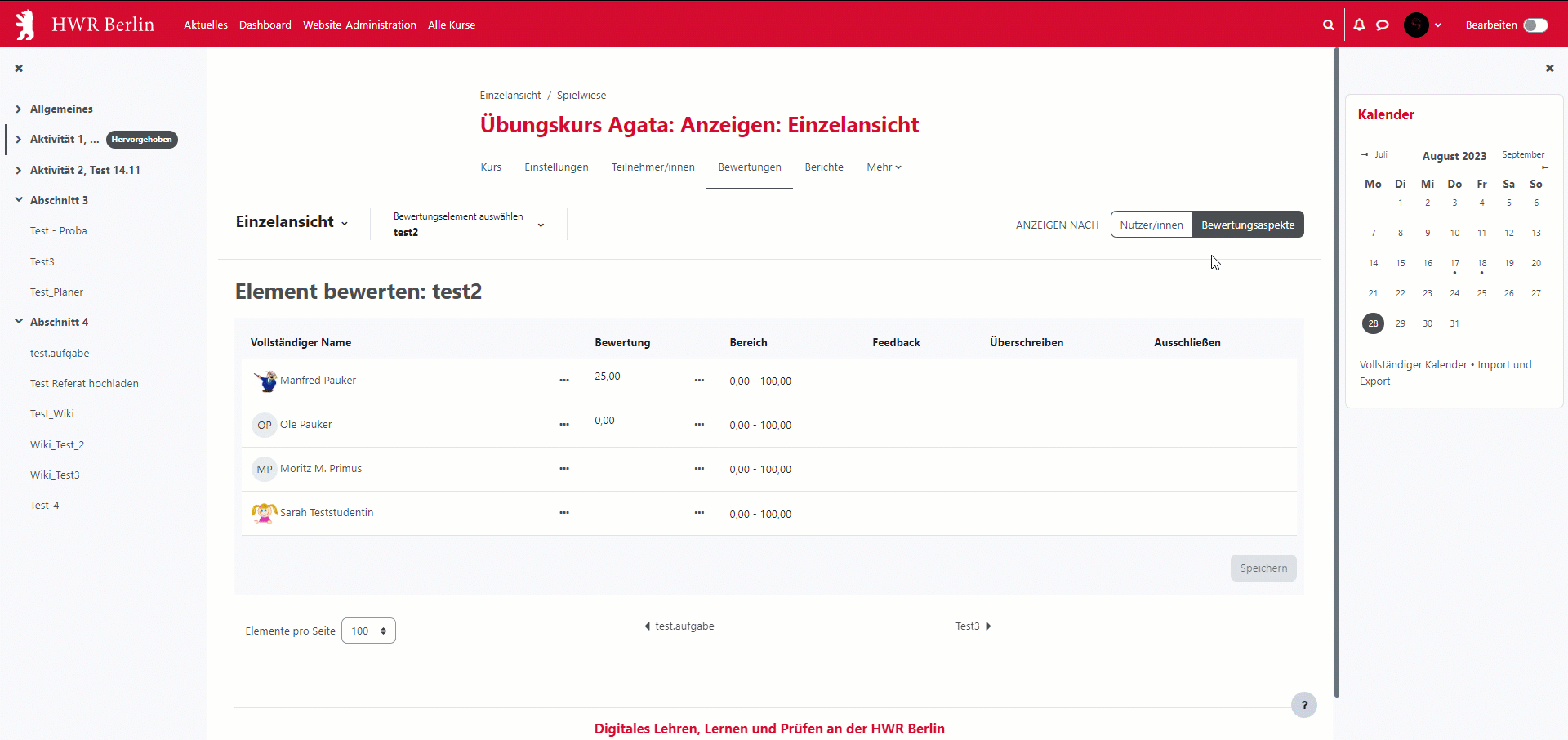 Die Übersicht erfasst alle bewertbaren Kurs-Aktivitäten und gibt einen gesammelten Einblick auf die Ergebnisse der Kursteilnehmenden. Der erfolgreiche/erfolglose Abschluss dieser Aktivitäten wird nun visuell ansprechender hervorgehoben. Hier finden Sie die Bewertungen für alle Ihre Studierenden im Kurs.