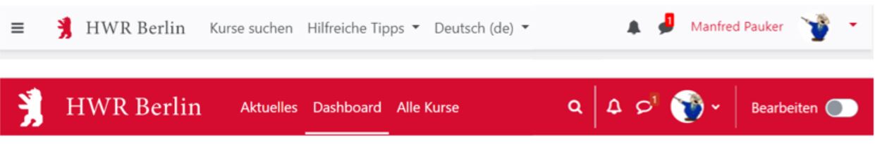 Sie werden viele Elemente im oberen Primärbalken der Startseite wiedererkennen. „Kurse suchen“ versteckt sich jetzt hinter dem Icon der Lupe. Die persönlichen Spracheinstellungen lassen sich mit vielen anderen Funktionen mit dem kleinen Pfeil neben dem Bild aufrufen. Den größeren „Bearbeitungsbutton“ als Schieberegler finden Sie einheitlich immer rechts oben.