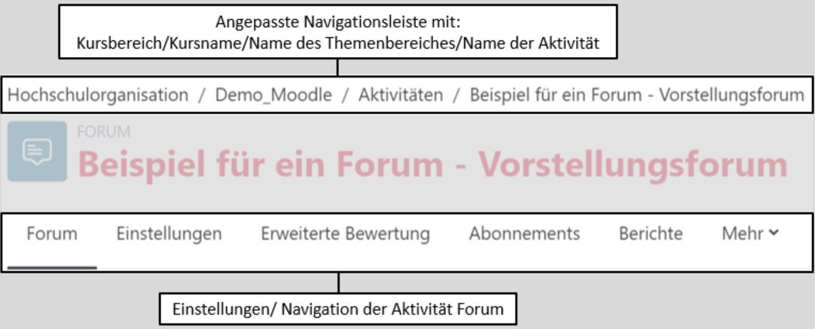 Die Navigation ist immer kontextbezogen und damit veränderlich. Bewegt man sich z. B. bei den Kurseinstellungen, bleiben die o.a. Tabs erhalten. Ist man in den Einstellungen bei einzelnen Aktivitäten passt sich die obere Leiste an und dient dann der Orientierung im Kurs.