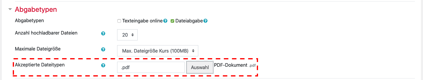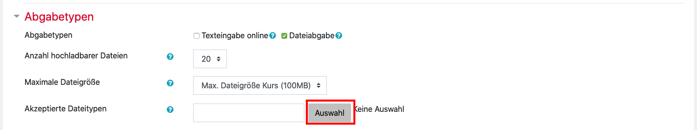2. Under the menu item ” Submission types” you will find the option “Accepted file types“. Click on “Choose“.