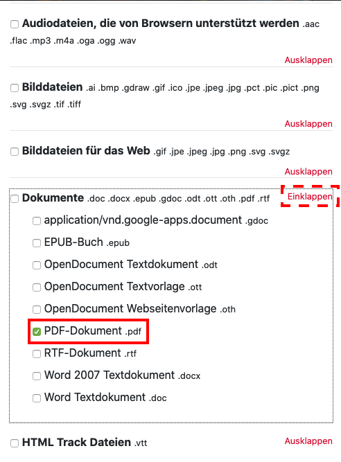3. In the following window you can allow whole groups of file types or individual formats for upload by ticking them.