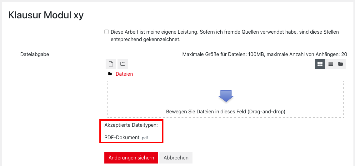 The term paper should be uploaded from a certain time x. Solutions can be uploaded up to time y. After the end of the processing time, submissions should no longer be possible. In order to submit a submission, a declaration of independence should be required.