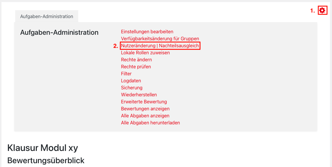 2. In the “Grading summary”, click on the action menu of the assignment (red cogwheel) in the upper right corner. In the “” Assignment administration” select the element “User overrides”.