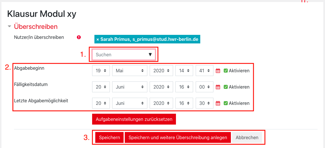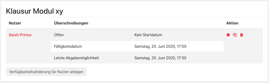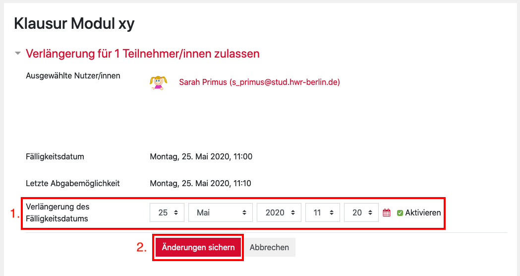 If an examinee has not managed to upload a submission within the set time period for justifiable and comprehensible reasons, you can extend submission times individually. To do this, proceed as follows: