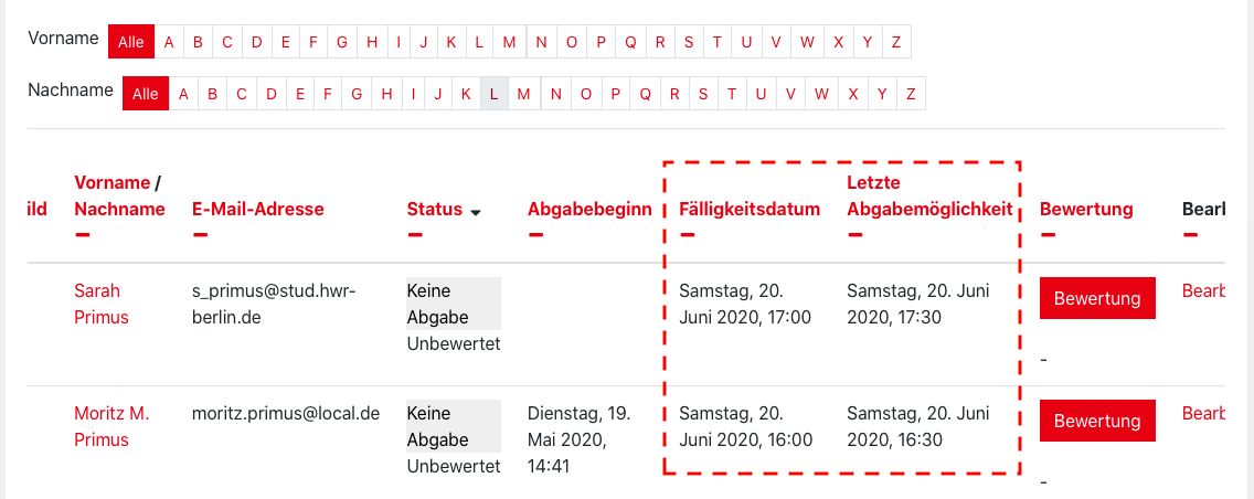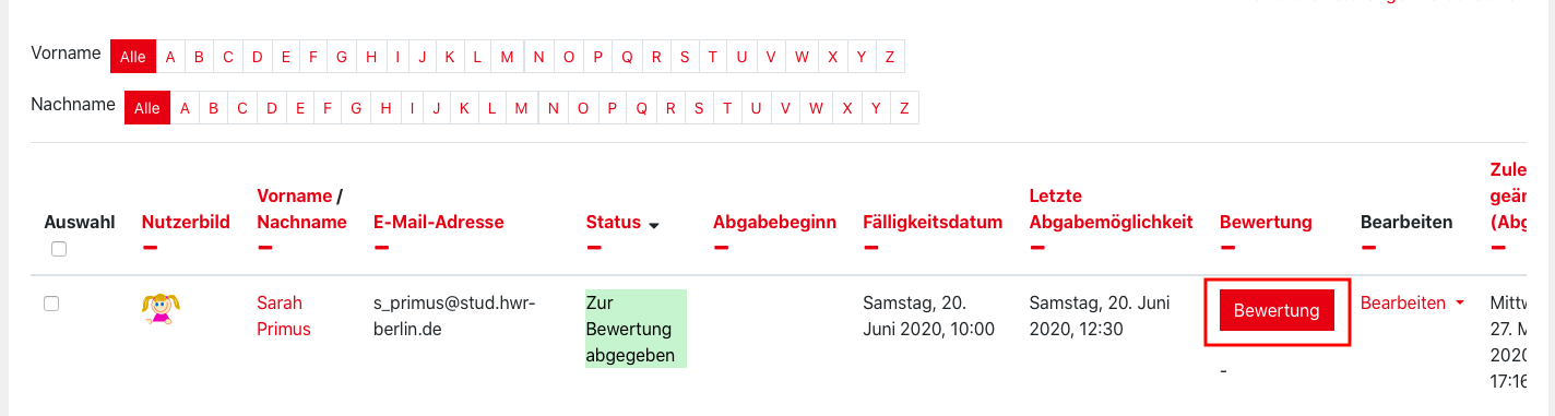 4. Wurden PDF-Dokumente abgegeben, können Sie einfach in der Zeile eines Studierenden auf „Bewertung“ klicken.
