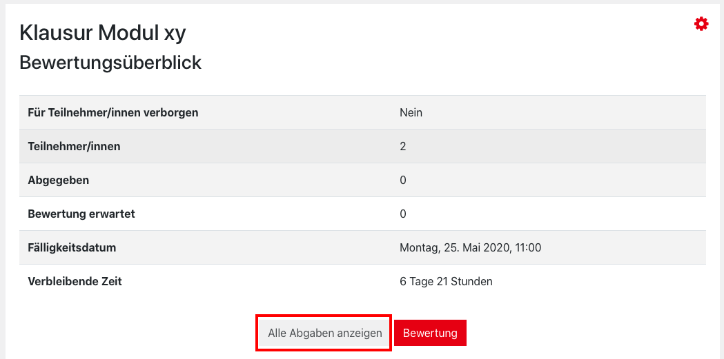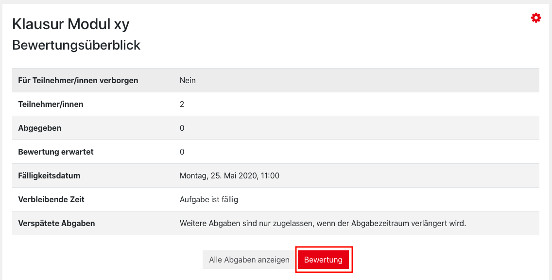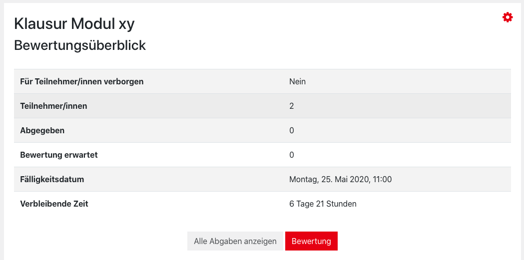 1. Navigate to the assignment in your course and open it by simply clicking on the name. In the grading summary you will find the action menu of the activity in the upper right corner (red cogwheel). Click it and select “Edit settings“.