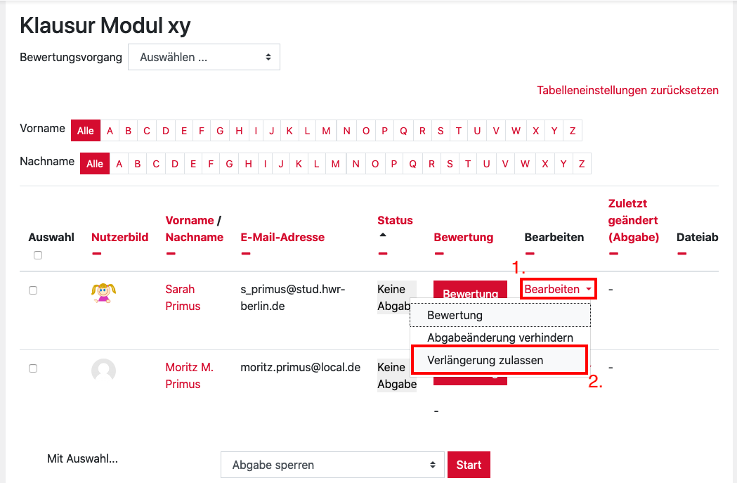 2. Navigate here to the corresponding examinee and select the “Edit” link in the corresponding row in the “Edit” column. Select the ” Grant extension” item in the drop-down menu.