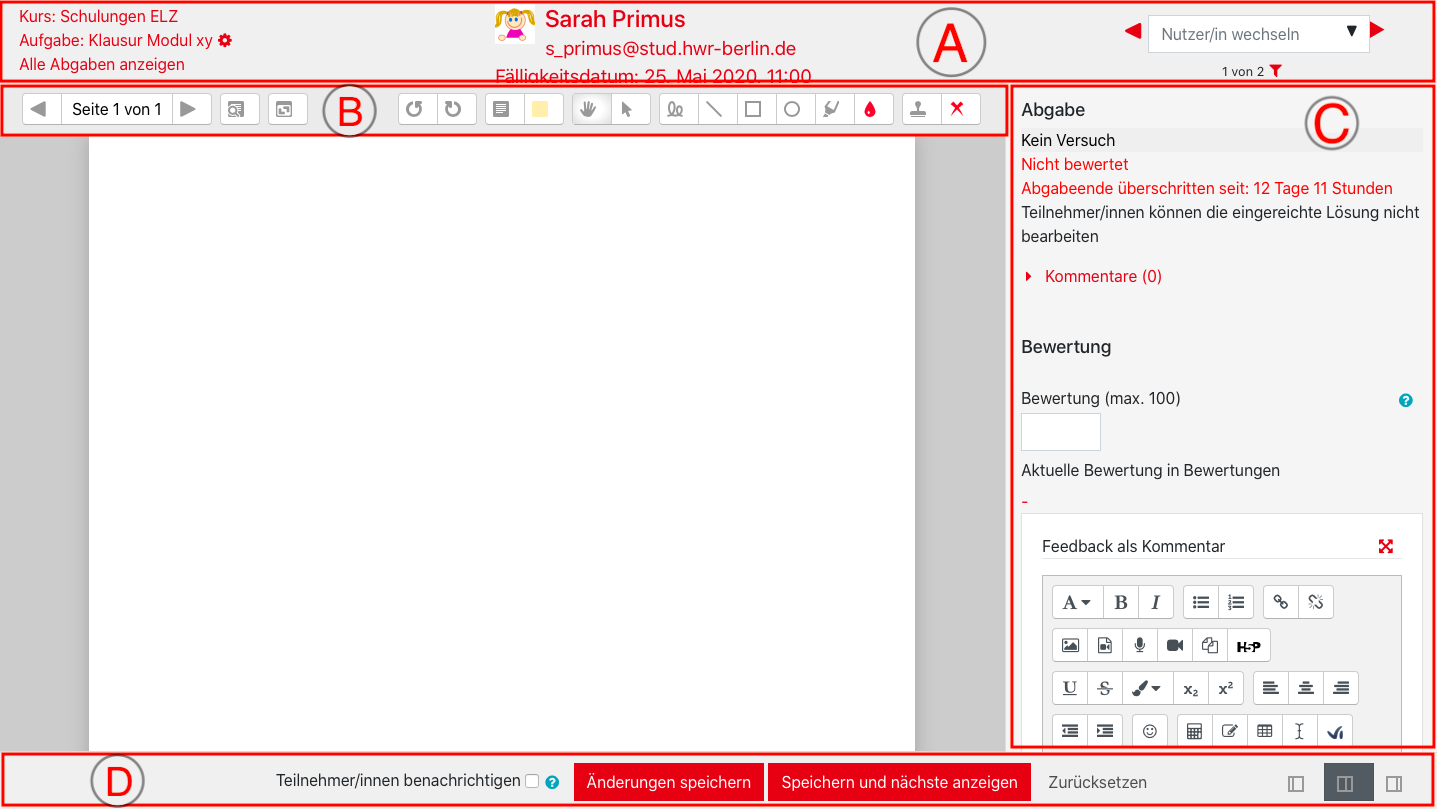 To do this, the submissions must first be downloaded, as mentioned under “View submissions”. Each document must be opened and corrected individually on the computer. If, for example, a Word document has been submitted, this is usually opened in a word processing program and can be corrected using the comment function, for example. PDF documents can be viewed and annotated using Acrobat Reader, for example.