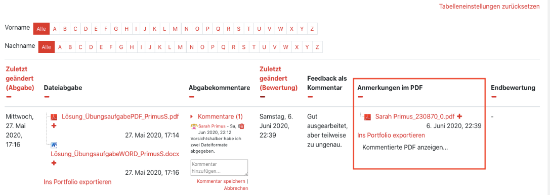 In the administrative area of the assignment activity, a submission overview is created where all uploaded documents (file type independent) can be accessed (see ” View Submissions”). For PDF submissions, you can grade directly in Moodle. You can find this and other grading options under “Correct submissions”.