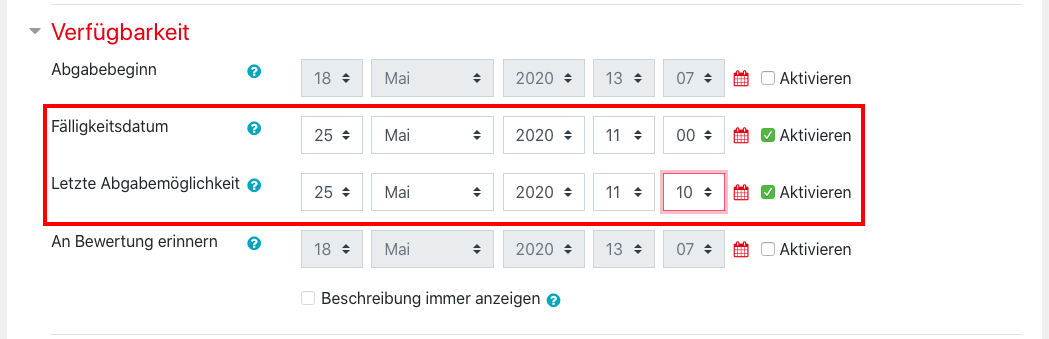 5. You can set the end of the submission period in the ‘Availability’ section. Settings under ‘Due date’ allow a delay range for submissions. Therefore, the ‘Last submission option’ should always be set for a definitive end to the submission period.