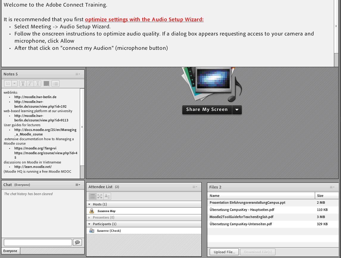 Alle anderen Funktionen sind einfach und ziemlich selbsterklärend, für Einsteiger finden sich zudem viele Hilfen als Leitfaden bei uns, auf den Seiten von Adobe oder frei im Netz. Das Einrichten des „Meetingraums“ mit den verschiedenen Pads ist sehr leicht. In unserem Fall hatte ich eine Auswahl an Dokumenten zum Download und hilfreiche Links im Vorfeld bereitgestellt. Der Bildschirm (bzw. gezielt einzelne Fenster) können einfach zur Ansicht freigeben werden.
