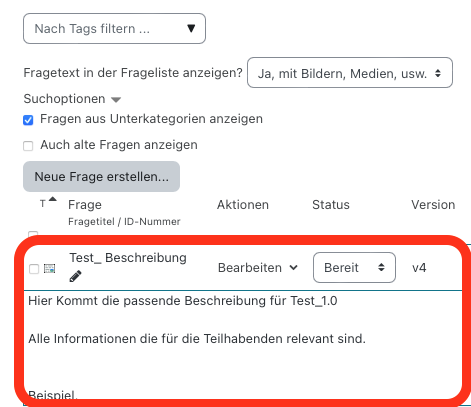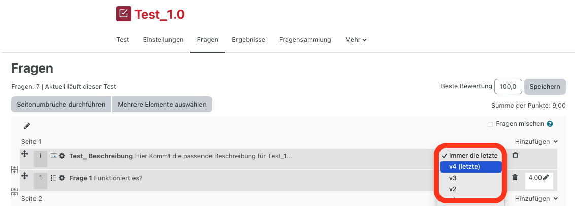 So bald Sie eine bestimmte Version einer Frage wieder benutzen wollen, können Sie diese in der Fragenübersicht eines Tests einstellen. Standardmäßig wird die letzte Version verwendet.