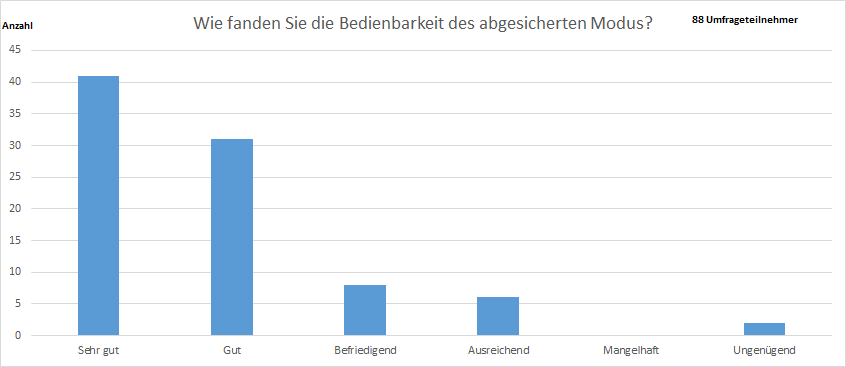 Eine Frage unserer Umfrage war, wie die Klausurteilnehmenden die Bedienbarkeit des abgesicherten Modus (Safe Exam Browser) fanden. Von den 88 Umfrageteilnehmenden fanden über 81% die Bedienbarkeit gut bis sehr gut.