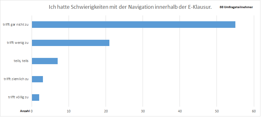 Wir haben auch gefragt, ob die Studierenden Schwierigkeiten mit der Navigation innerhalb der E-Klausur hatten. Hier haben von den 88 Befragten mehr als 85% geantwortet, dass dies wenig bis gar nicht zutrifft.