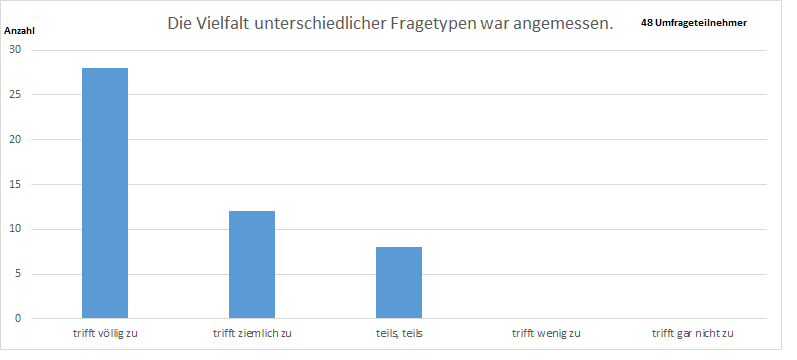 Auch bei der Frage nach der Vielfalt der Fragetypen empfand die Mehrheit der Umfrageteilnehmenden diese als angemessen. Neben den gewohnten Freitextaufgaben und Multiple-Choice Fragen können auch Fragetypen genutzt werden, welche Drag & Drop Elemente enthalten oder auch Lückentexte mit vordefinierten Antwortmöglichkeiten.