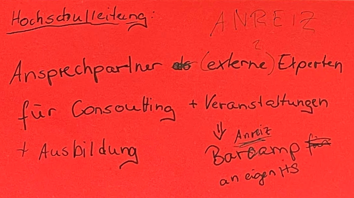 In einem Abschlussworkshops kreierten wir Persona, die im Zusammenhang mit OER stehen oder stehen könnten und analysierten in Prozessen, was dieser Personengruppe im Zusammenhang mit der Förderung von OER helfen könnte. Dier Ergebnisse wurden gesammelt und sollen später noch ausgewertet werden.