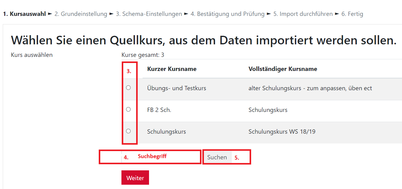 2. Sollte der zu importierende Kurs als einer der ersten gelistet werden, kann dieser direkt ausgewählt werden (3.). Ansonsten kann unten in der Suchleiste (4.) der enstprechende Kurs gesucht (5.) und ausgewählt werden. Am einfachsten findet man den Kurs über den kurzen Kurstitel.