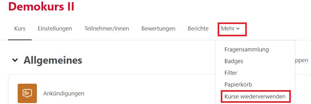 1. Gestartet wird in dem Moodlekurs, in den etwas importiert werden soll. In diesem klicken Sie In der Kursmitte auf den Reiter Mehr und in dem Menü, das sich dann öffnet auf Kurse wiederverwenden.
