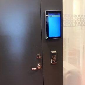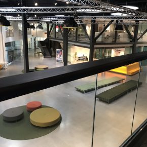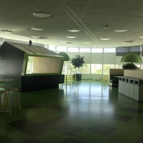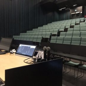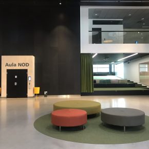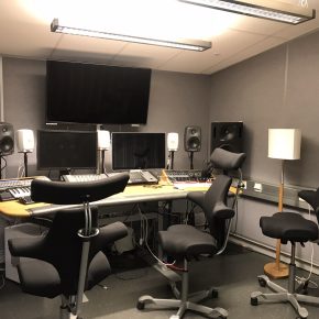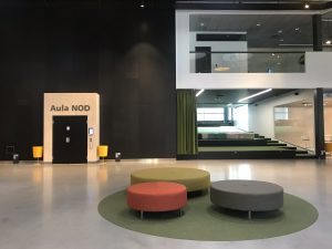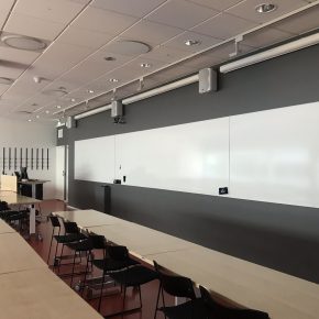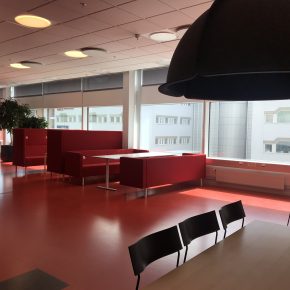 Anschließend wurde ich durch das sehr moderne Gebäude geführt. Alle Räume sind mit Whiteboeards und Lautsprecheranlagen ausgestattet. Viele Räume verfügen zusätzlich über ein Videokonferenzsystem, die Universität Stockholm nutzt den Anbieter Polycom. Die Medienanlagen in den Räumen werden durch Touchpanels auf dem Dozententisch gesteuert. Es gibt Räume für die Studierenden zum Aufnehmen von Ton und Musik, Videos und Schnittplätze zur Bearbeitung der Medien. Die Aufenthaltsräume sind hell und bunt gestaltet.