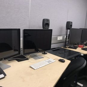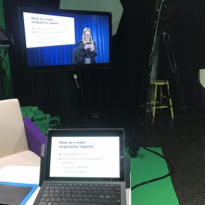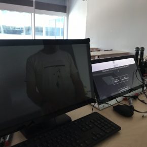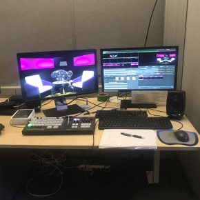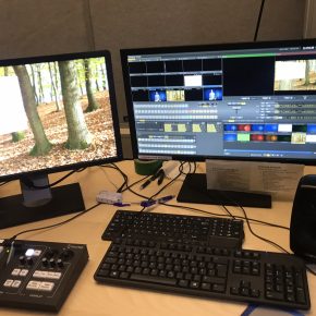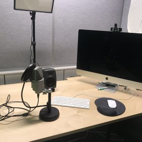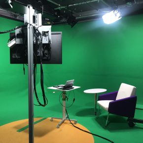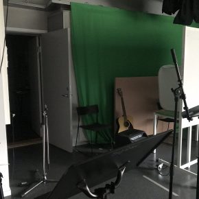 Nach der Rundführung habe ich den Leiter der Abteilung Video kennengelernt. Er hat ein Videostudio mit großer Greenscreen-Wand eingerichtet. Hier werden Lehrfilme aber auch News-Shows für die Hochschule gedreht. Außerdem gibt es Extraräume, in denen Lehrende Ihre Videos bearbeiten oder Podcasts einsprechen können.