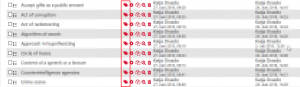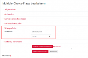 Es ist möglich Fragen zu verschlagworten und in der Fragensammlung sowie beim Hinzufügen von Zufallsfragen nach Schlagwörtern zu filtern. Bei Freitext-Fragen können auch Dateien als Antwort bzw. als Kommentar bei der Bewertung hochgeladen werden.