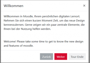 Haben Sie schon unsere Moodle-User-Tour durchlaufen, um alle Neuheiten zu entdecken? Wir haben erstmals geführte Schritt-für-Schritt Anleitungen in Moodle aktiviert, um Sie dabei zu unterstützen, schnell mit der neuen Oberfläche vertraut zu werden. Jede Tour können Sie mit den ‚Weiter‘ und ‚Zurück‘ Button selbst steuern. Möchten Sie eine Tour nochmals durchlaufen finden Sie im Fußbereich den Link ‚Tour erneut starten‘.