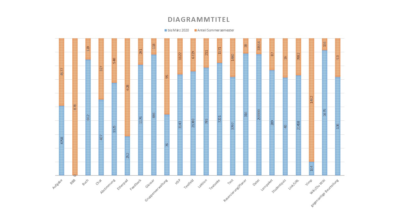 Die Verwendung von „Aufgabe“ (Zuwachs 96%) und „Test“ (Zuwachs (40%) überschneiden sich in der Praxis, da in diesem Semester Klausuren teilweise mit der Aufgabe zum Download zum „Offline-Ausfüllen“ angeboten wurden.