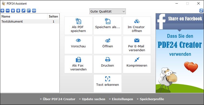 Eine andere Möglichkeit wäre, über Datei und Drucken in die Druckeinstellungen zu gehen und dort als Drucker PDF24 auszuwählen, um die Datei direkt an PDF24 zu übertragen. Auf diese Weise öffnet sich direkt der PDF24-Assistant, in welchem man die ersten Anpassungen des Dokumentes vornehmen kann.