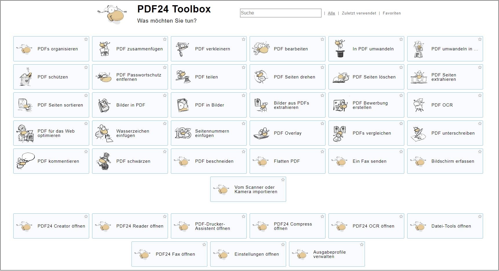 Starten Sie nun PDF24, um die PDF24 Toolbox aufzurufen. In diesem Werkzeug haben Sie nun allerhand Möglichkeiten, Ihr Dokument zu Bearbeiten.