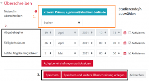 Bei der Aufgabe  können Sie den Abgabebeginn, das Fälligkeitsdatum und die letzte Abgabemöglichkeit einstellen. Klicken Sie anschließend auf Speichern oder Speichern und weitere Änderung bzw. weitere Überschreibung anlegen wenn Sie noch weitere Nachteilsausgleiche anlegen möchten.