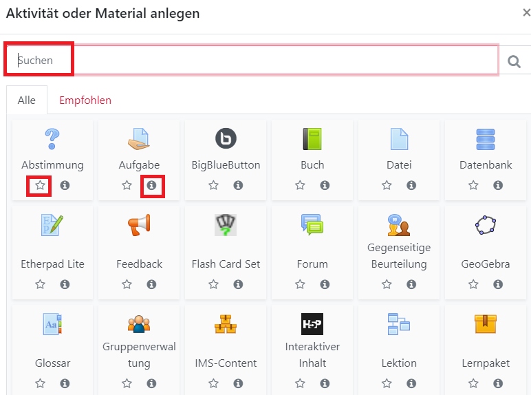 Klickt man auf der Kursoberfläche auf Aktivität oder Material anlegen, wird die Auswahl nun in alphabetischer Reihenfolge und nicht mehr gesondert nach Aktivität oder Material angezeigt. Es kann nach einzelnen Aktivitäten/ Materialien gesucht werden, Favoriten können angelegt (über den Stern) sowie weitere Informationen angezeigt werden (Klick auf das i = Information).