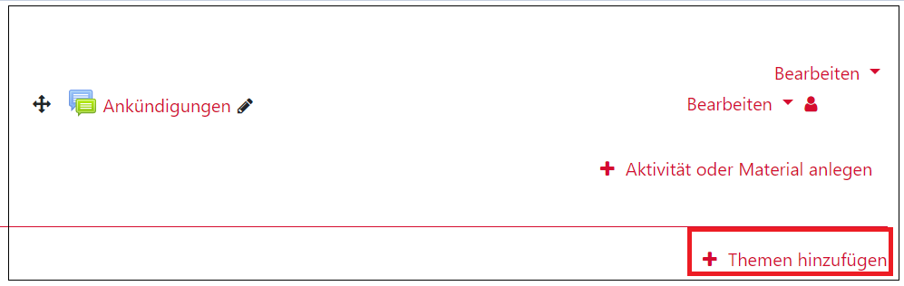 Des Weiteren sind die Kurse per Voreinstellung nur mit einem Themenbereich ausgestattet. Lehrende können weitere Themenbereiche selbst hinzufügen. Dafür klicken sie im Bearbeitungsmodus auf das Plus unter dem ersten Themenfeld.