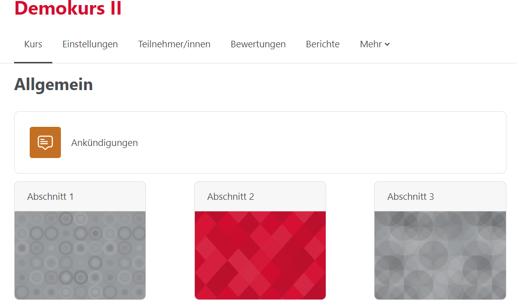 Auch dieses Format eignet sich für den Einsatz in inhaltlich umfangreichen Kursen. Ein Pluspunkt liegt in einer übersichtlichen Komplettansicht ohne umfangreiches Scrollen. Es ist modular aufgebaut. Jedes Thema/ jeder Kursabschnitt wird durch einen Kasten dargestellt. Die Inhalte der einzelnen Themen bleiben jedoch verborgen und erscheinen erst mit Klick auf den jeweiligen Bereich. Im Bearbeitungsmodus kann für jeden Kasten ein individuelles Bild hinzugefügt werden.