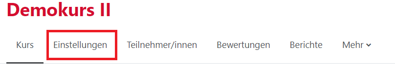 Um das Kursformat zu ändern, ruft man die Einstellungen des Kurses auf. Diese findet man in der Mitte des Kurses unter dem Reiter Einstellungen.