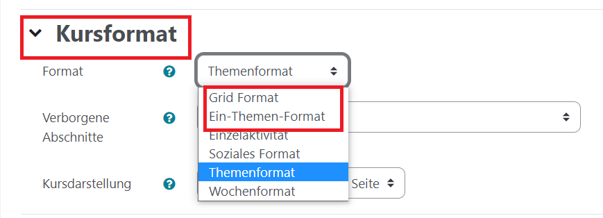Unter Kursformat wählt man das gewünschte Format aus. Standardmäßig im Kurs voreingestellt ist das Themenformat.