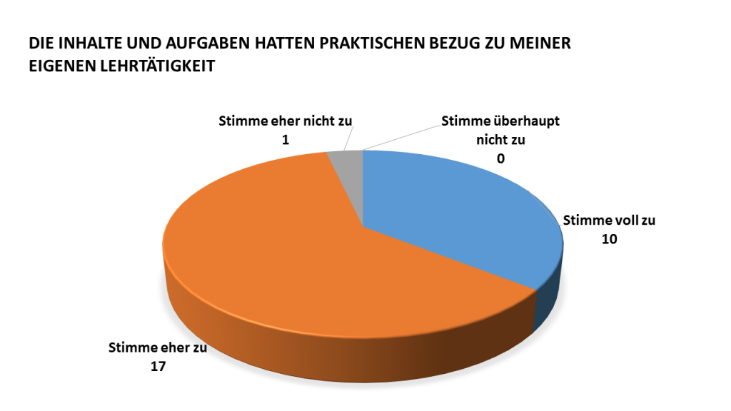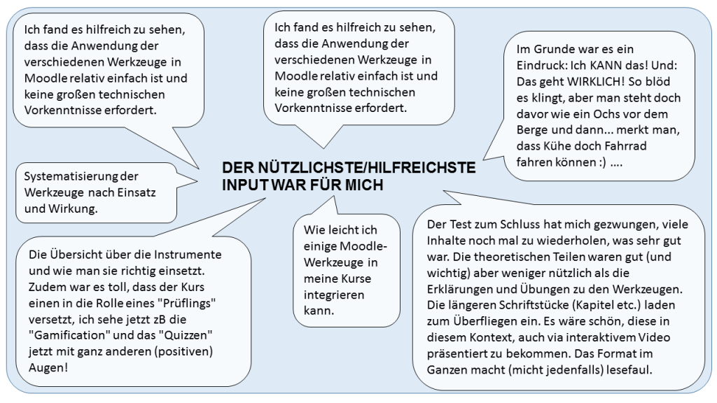 Der Kurs läuft gut und das Feedback der Teilnehmenden ermöglicht uns eine stetige Optimierung unseres Angebots. Wir haben beispielsweise gefragt, welche Änderungen sie für den jeweils nächsten Durchgang vorschlagen. So haben wir die Kommunikationskanäle deutlich reduziert und stellen seit dem 4. Intake für jede Woche eine Zusammenfassung der Inhalte als Infografik bereit. Außerdem erhielten wir Hinweise wie wir die Inhalte und Zeitfenster noch besser auf die Bedürfnisse der Lehrenden anpassen können.